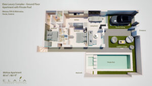 Tucked away on the garden level with its own private entrance, Melissa offers a uniquely independent living experience within the Elaia Luxury Complex — combining the intimacy of a villa with the comforts of a designer apartment. Spanning 80 m², this thoughtfully designed residence offers a sense of space and freedom that far exceeds its size.