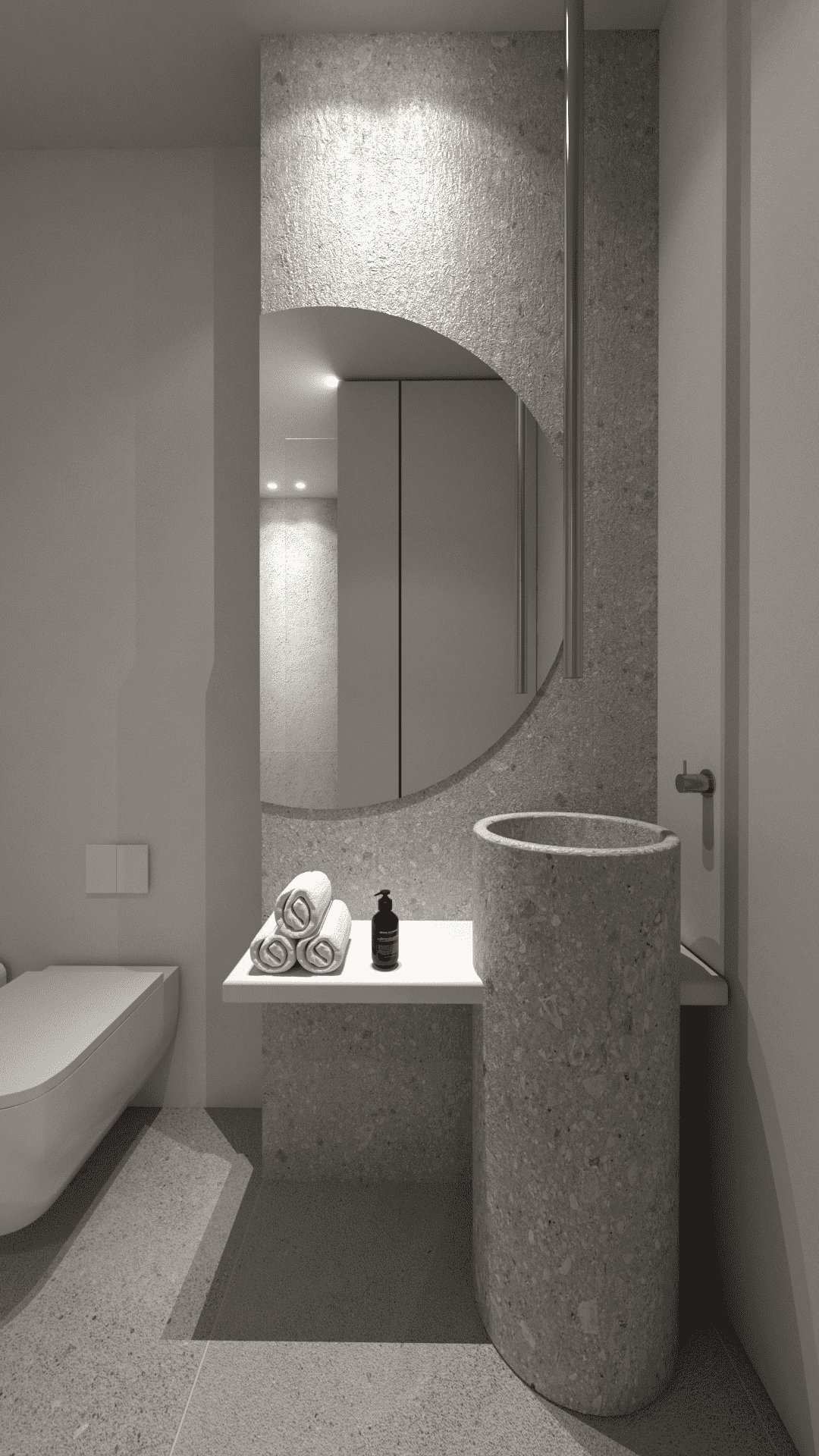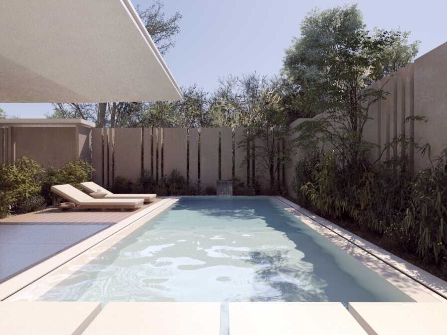 Step outside and you’re welcomed into a lush private garden with a dazzling pool as its centerpiece. The pool features an in-water lounge area with integrated hydromassage jets and a tranquil waterfall — the sound alone invites calm and serenity. Just a few gentle steps lead you from the pool area directly to the residents-only wellness space, where a fully equipped gym, sauna, and hammam are available by appointment.